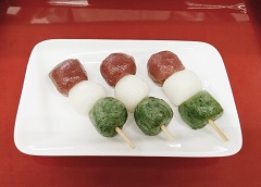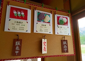 |  |  |  | |  | 餅三彩 3個入 450円 1個(150円)からでも販売しております。 | 三色だんご 3本入 300円 1本(100円)からでも販売しております。 | おはぎ 2個入 300円 |  | |  | 揚げおかき 1袋 300円 | きび羽二重 1カップ 200円 | 切り餅 1袋 550円 | | |  きびもちソフトクリーム 300円 バニラベースに地元産のものを加工して作られた きび粉やもち粉を混ぜ合わせてできた ソフトクリームです。 ふんわり香ばしいような独特の風味が 人気を呼んでいます! (※冬期販売中止) |  | | | | | |